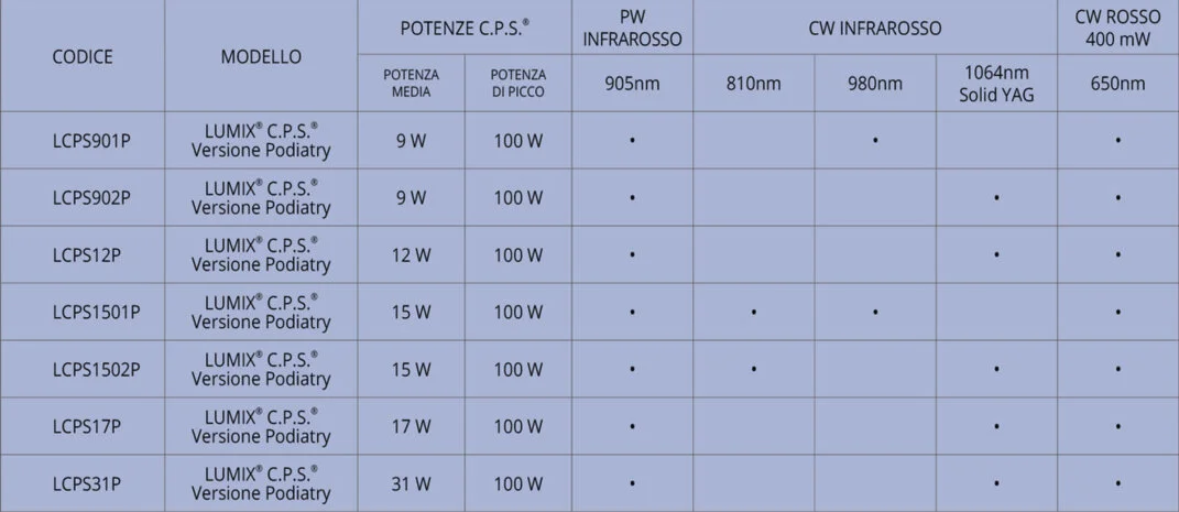 LUMIX® C.P.S.® Podiatry è l’unico laser multidiodico ad alta potenza con emissione C.P.S.® (Continua, Pulsata e Superpulsata) studiato per il Podologo.