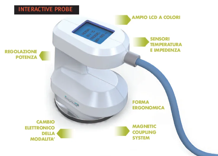 Sono quelli classici della tecarterapia, ottenuti grazie all’impiego del manipolo e di un elettrodo neutro più grande. Interactive Probe rappresenta una vera e propria rivoluzione. Le soluzioni tecnologiche impiegate consentono di shiftare da una modalità all’altra senza sostituire l’elettrodo; è l’elettronica a bordo del manipolo che consente modalità capacitiva o resistiva.