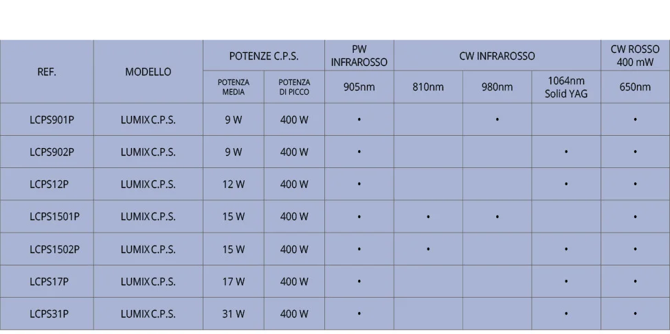LUMIX® C.P.S.® Podiatry è l’unico laser multidiodico ad alta potenza con emissione C.P.S.® (Continua, Pulsata e Superpulsata) studiato per il Podologo.