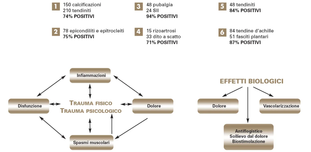 La Terapia con Onde d'Urto si è rivelata particolarmente efficace nel trattamento delle patologie tendinee, nella borsite, nella stimolazione della riparazione dei tessuti in generale, dove iperemia e vascolarizzazione locale giocano un ruolo importante e la stimolazione meccanica induce sollievo dal dolore.
